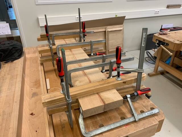 The original construction drawing of the Hoogaars did not specify a thickness (or any measurements, for that matter), so we had to come up with that ourselves. What you usually employ for your lower deck is double the thickness of your hull . In our case, the hull is 2.3 cm thick and we opted for a deck thickness of 4 cm. The plane consists of four beams. Because we were not sure whether they could be bent into shape properly, we did a test with one beam. With the help of a lot of clamps and Lukas' weight with a few pairs of heavy beams, we managed to get it into shape.